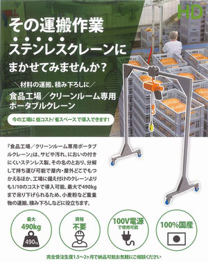 ステンレス製「食品工場/クリーンルーム専用ポータブルクレーン」を